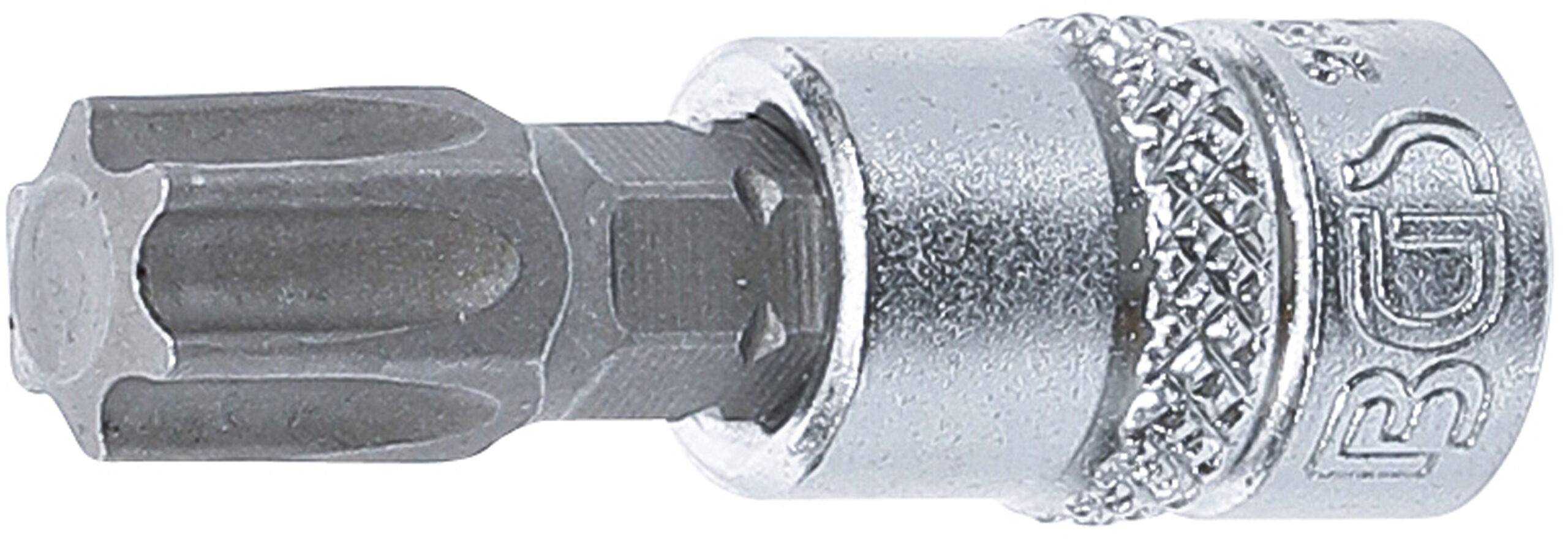 mit Rändelung Technische Daten Bruttogewicht 30 g Abtriebsprofilgröße T50 Oberflächenvergütung Verchromt matt Antriebsprofilgröße metrisch 63 mm Länge 38 mm Antriebsprofil Innenvierkant Abtriebsprofil T-Profil für Torx Antriebsprofilgröße imperial 14