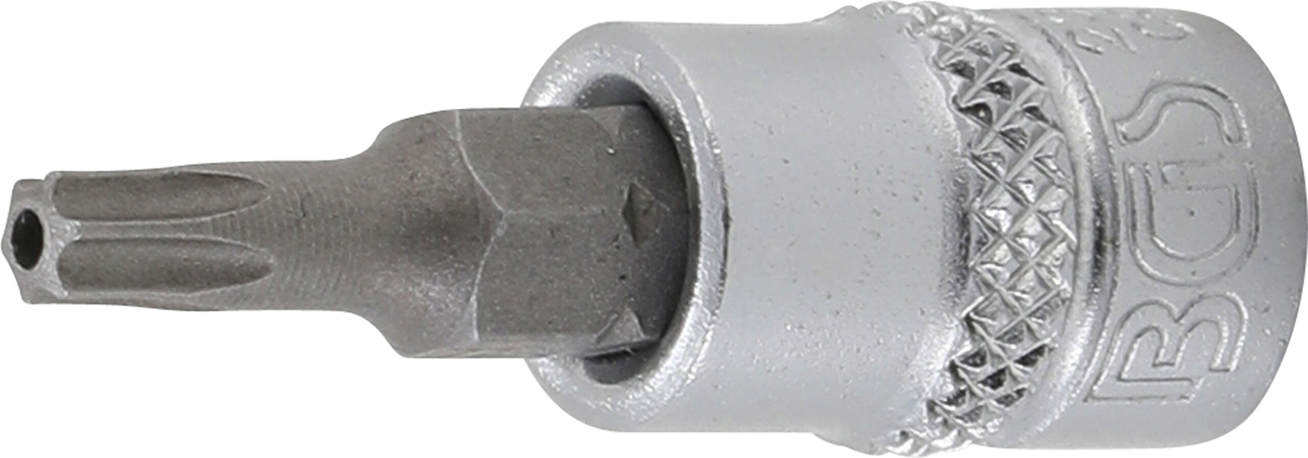 mit Rändelung Technische Daten Abtriebsprofilgröße T20 Bruttogewicht 20 g Antriebsprofilgröße metrisch 63 mm Antriebsprofilgröße imperial 14 Länge 38 mm Abtriebsprofil T-Profil für Torx mit Bohrung Oberflächenvergütung Verchromt matt Material Chrom-Vanadium-Stahl Antriebsprofil Innenvierkant
