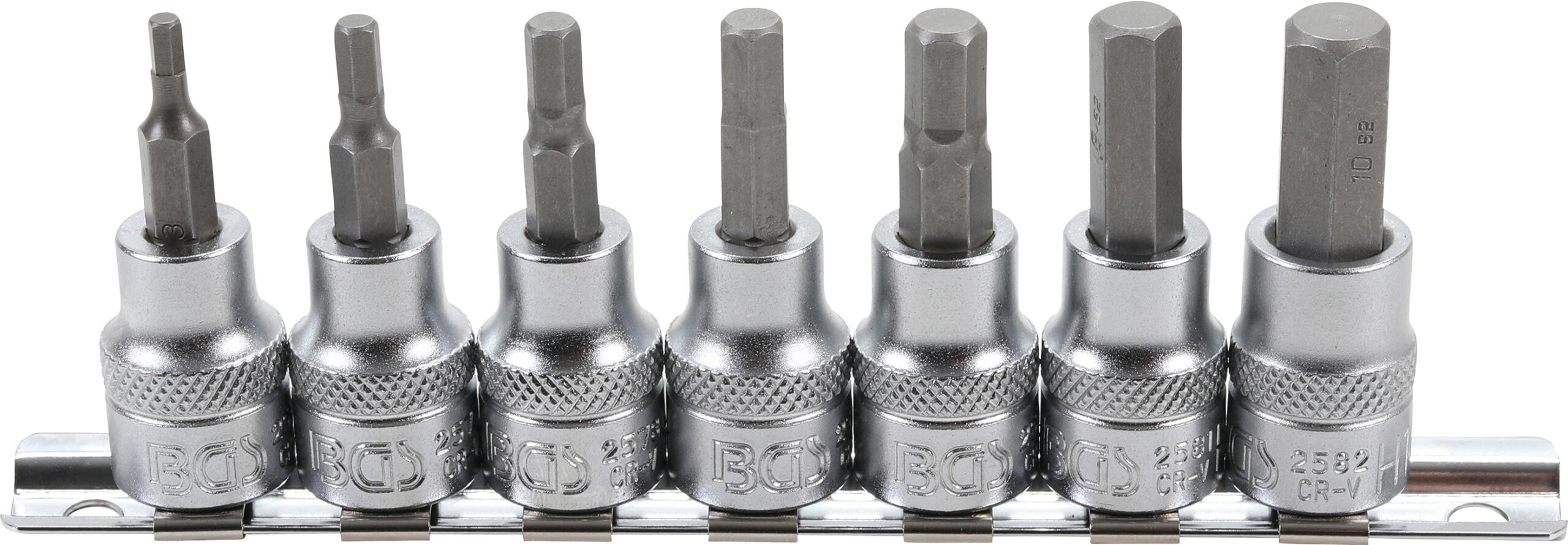 mit Rändelung auf Metallschiene Lieferumfang Bit-Einsätze Antrieb Innenvierkant 10 mm 38 Abtrieb Innensechskant 3 – 4 – 5 – 6 – 7 – 8 – 10 mm Technische Daten Verpackung für Wandbehang geeignet Ja Bruttogewicht 320 g Material Chrom-Vanadium-Stahl Abtriebsprofil Innensechskant Oberflächenvergütung Verchromt matt