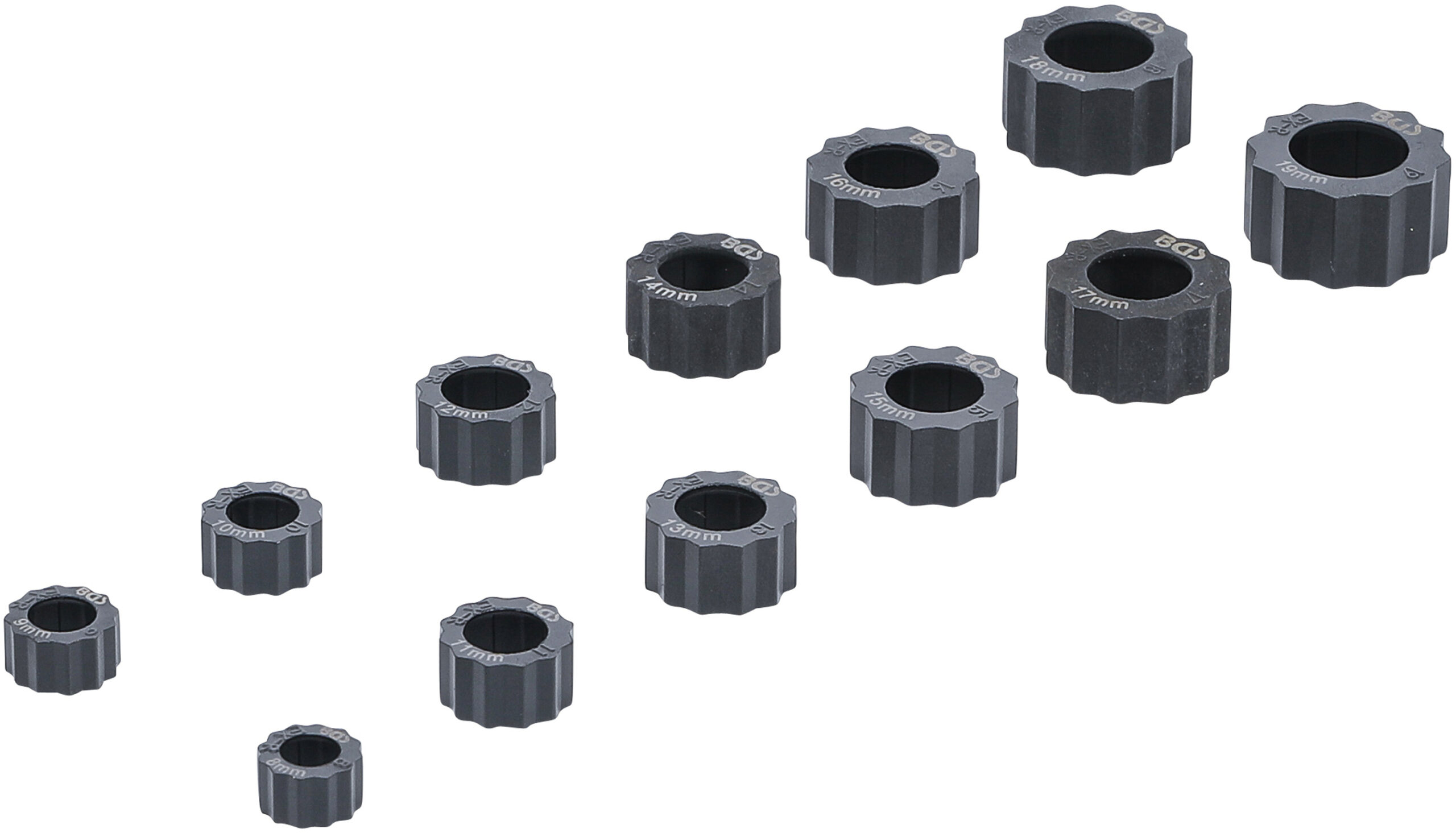 erwendbar mit Zwölfkant-Steckschlüssel oder Ringschlüssel zur Demontage abgerundeter Sechskantmuttern oder Schrauben besonders geeignet für Auspuffbauteile bei denen die Abflachungen von korrodierten und festsitzenden Sechskant-Muttern oder Schrauben durch Löseversuch abgerundet sind erwendbar an bis zu 65 % abgerundeten Muttern oder Schrauben beinhaltet 12 Adapterkappen in folgenden Größen 8 – 9 – 10 – 11 – 12 – 13 – 14 – 15 – 16 – 17 – 18 – 19 mm Härte 40 – 45 HRC Technische Daten Oberfl…