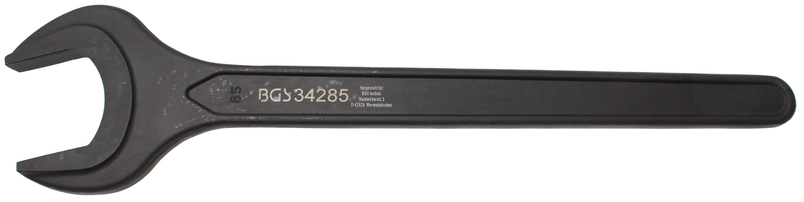 Industrie-Maulschlüssel für besonders schwere Montagen mit langem Schaft für tiefliegende Verschraubungen und hohe Drehmomente sicherer Griff durch Profilschaft warm geschmiedet Technische Daten Kopfstärke 23 mm Oberflächenvergütung Phosphatiert Länge 665 mm DIN 894 Schlüsselweite 85 mm Bruttogewicht 4500 g Material Werkzeugstahl C45 Maulstellung 15 Verpackung für Wandbehang geeignet Nein Kopfbreite 170 mm