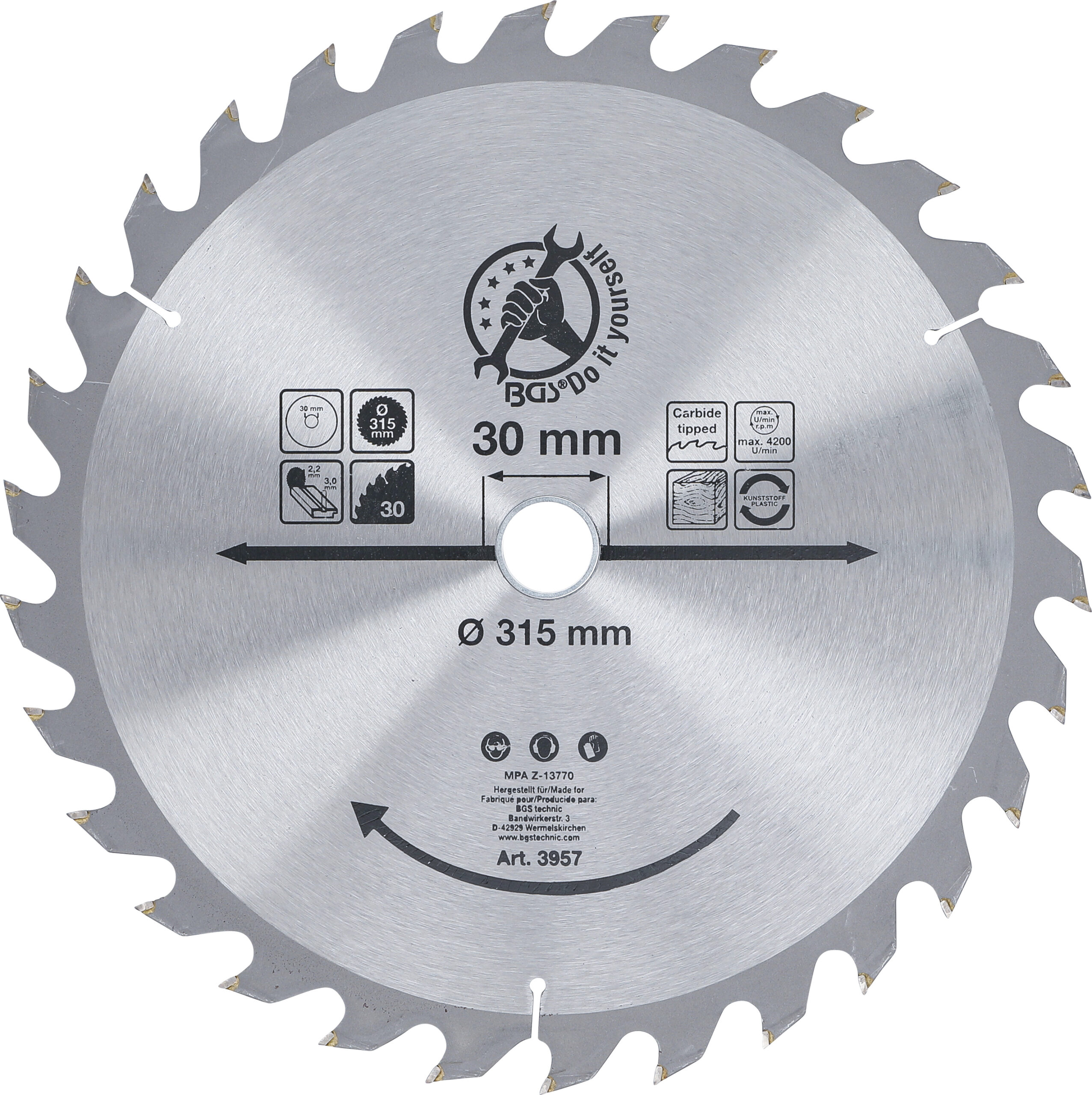 MPA zertifiziert Zähne aus Hartmetall Technische Daten Schnittbreite 30 mm Verpackung für Wandbehang geeignet Ja Durchmesser 315 mm Bohrungsdurchmesser 30 mm Drehzahl max. 4200 Umin Bruttogewicht 1130 g Zähne 30 Stärke Sägeblatt 22 mm