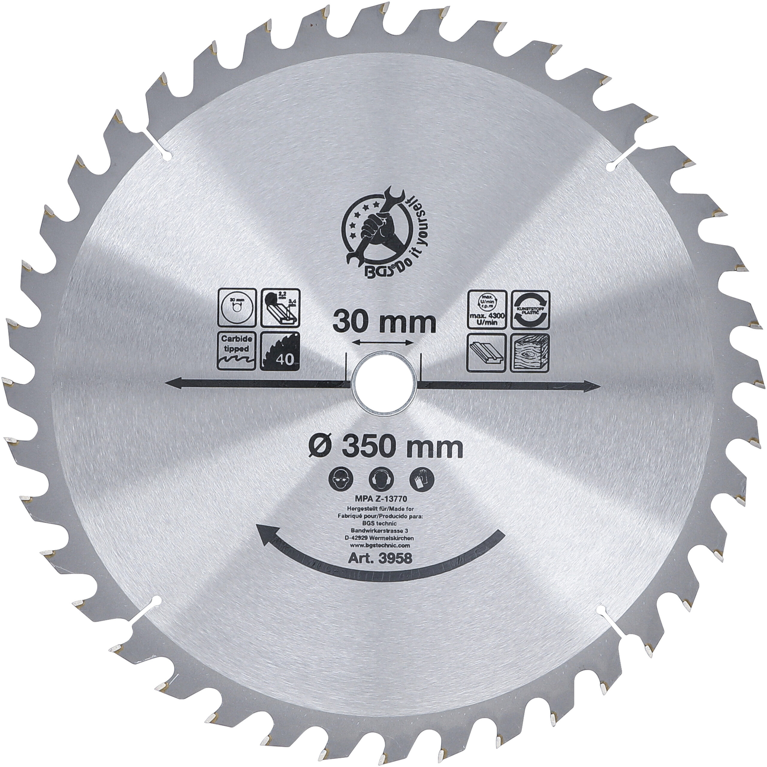 MPA zertifiziert Hartmetall-Zähne Technische Daten Bruttogewicht 1670 g Zähne 40 Bohrungsdurchmesser 30 mm Drehzahl max. 4300 Umin Durchmesser 350 mm Stärke Sägeblatt 22 mm Schnittbreite 34 mm