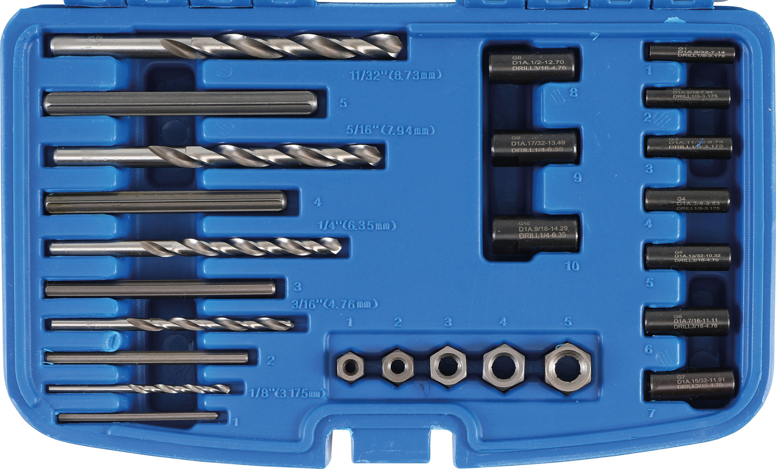 ermöglicht ein professionelles Herausdrehen von abgebrochenen Schrauben und Stehbolzen mindert den Zeit- und Kostenaufwand HSS-Stahl Lieferumfang 5 HSS Bohrer 32 – 48 – 64 – 80 – 87 mm 10 Bohrer-Führungsbuchsen 5 Ausdrehbolzen 5 Ausdrehadapter Technische Daten Bruttogewicht 932 g