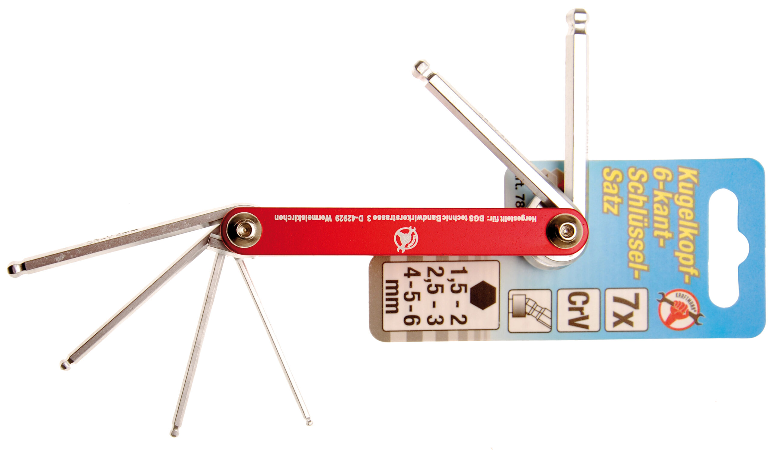 mit Kugelkopf für schlecht zugängliche Stellen matt verchromte Innensechskant-Schlüssel Abtrieb Innensechskant mit Kugelkopf 15 – 2 – 25 – 3 – 4 – 5 – 6 mm im rot eloxierten Klapphalter Technische Daten Abtriebsprofil Innensechskant mit Kugelkopf Material Chrom-Vanadium-Stahl Bruttogewicht 110 g Höhe 19 mm Verpackung für Wandbehang geeignet Ja Länge 99 mm Breite 32 mm