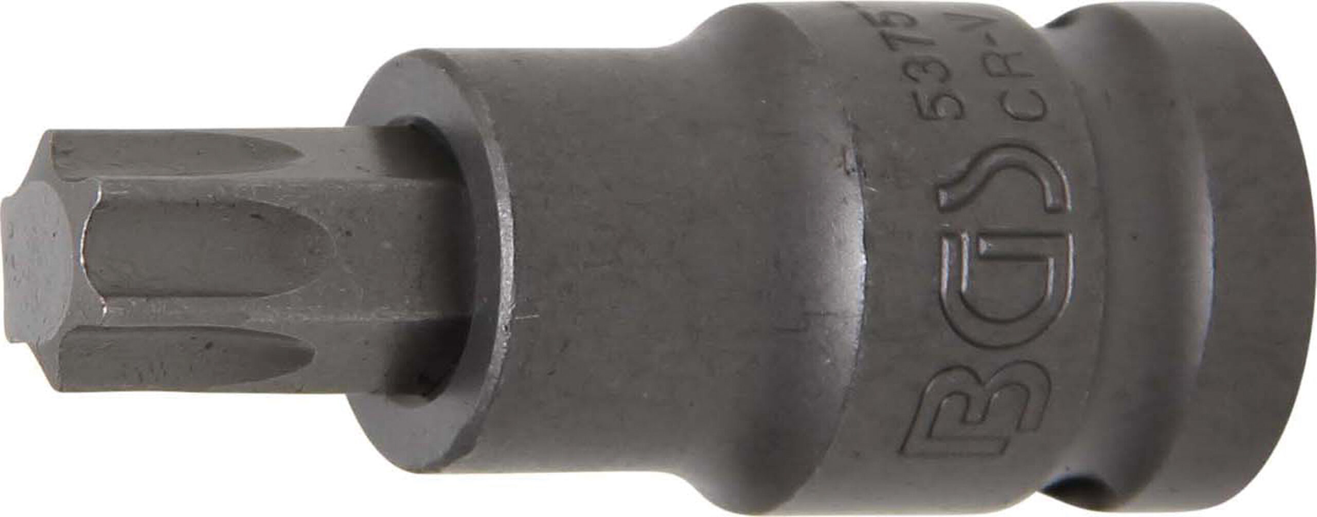geeignet für Hand- und Schlagschrauberbetrieb mit Aufnahme für Arretierstift und Gummiring Technische Daten Material Chrom-Vanadium-Stahl Abtriebsprofilgröße T55 Länge 53 mm Bruttogewicht 80 g Antriebsprofil Innenvierkant Antriebsprofilgröße metrisch 125 mm Oberflächenvergütung Brüniert Antriebsprofilgröße imperial 12 Abtriebsprofil T-Profil für Torx