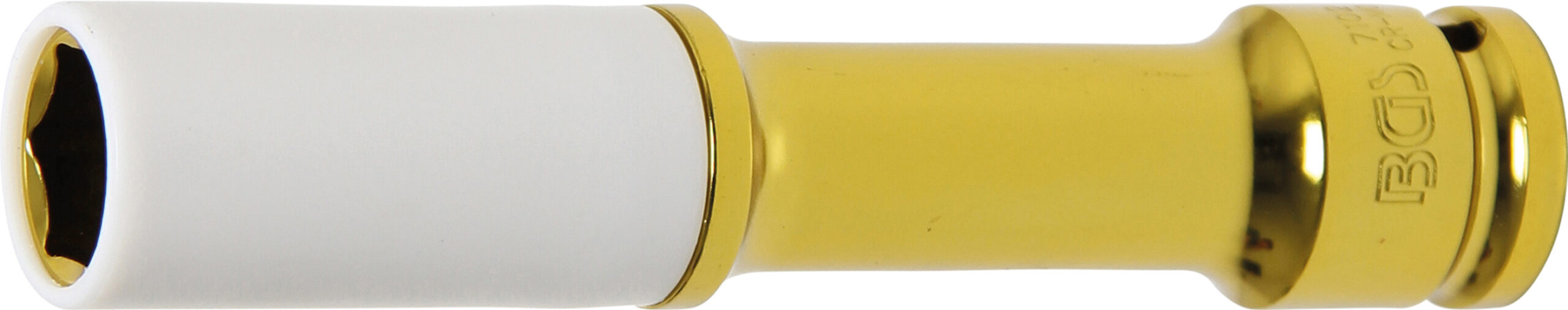 für Hand- und Schlagschrauberbetrieb geeignet mit Aufnahme für Arretierstift und Gummiring mit Kunststoffmantel und Kunststoffeinsatz zum Schutz der Alufelgen farblich codierte Nuss extra lang für Tiefbettfelgen Ersatz-Kunststoffmantel erhältlich unter Art. 7205 Technische Daten Bruttogewicht 460 g Länge 150 mm Schlüsselweite 19 mm Antriebsprofilgröße metrisch 125 mm Antriebsprofilgröße imperial 12 Antriebsprofil Innenvierkant Material Chrom-Molybdän-Stahl Verpackung für Wandbeha…
