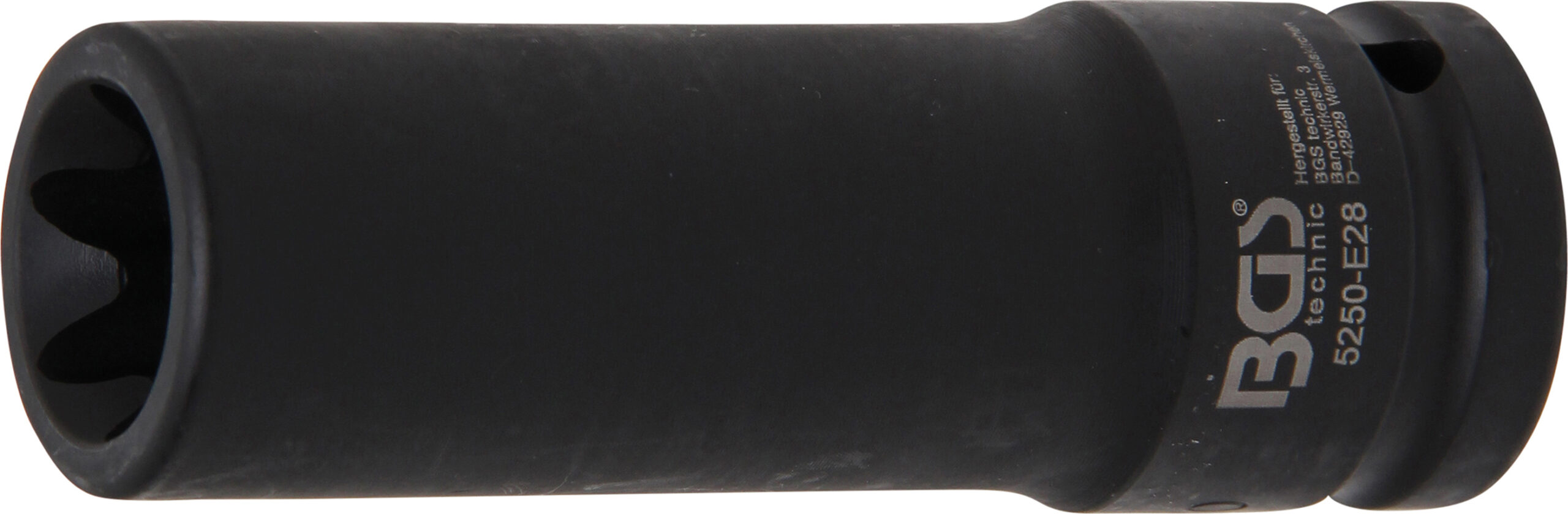 für Hand- und Schlagschrauberbetrieb geeignet mit Aufnahme für Arretierstift und Gummiring Technische Daten Antriebsprofilgröße imperial 34 Antriebsprofilgröße metrisch 20 mm Abtriebsprofil E-Profil Schlüsselweite E28 Länge 110 mm Antriebsprofil Innenvierkant Material Chrom-Molybdän-Stahl Bruttogewicht 680 g