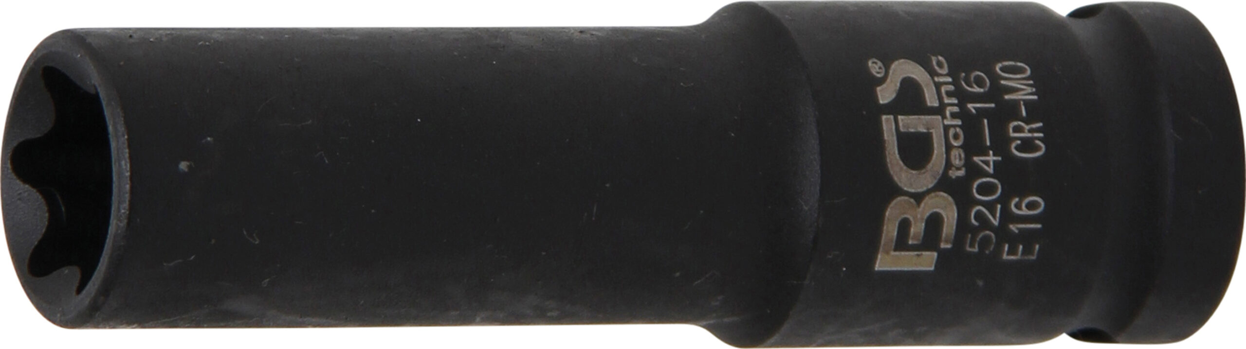 für Hand- und Schlagschrauberbetrieb geeignet mit Aufnahme für Arretierstift und Gummiring Technische Daten Abtriebsprofil E-Profil Antriebsprofilgröße metrisch 125 mm Material Chrom-Molybdän-Stahl Antriebsprofilgröße imperial 12 Bruttogewicht 110 g Schlüsselweite E16 Antriebsprofil Innenvierkant