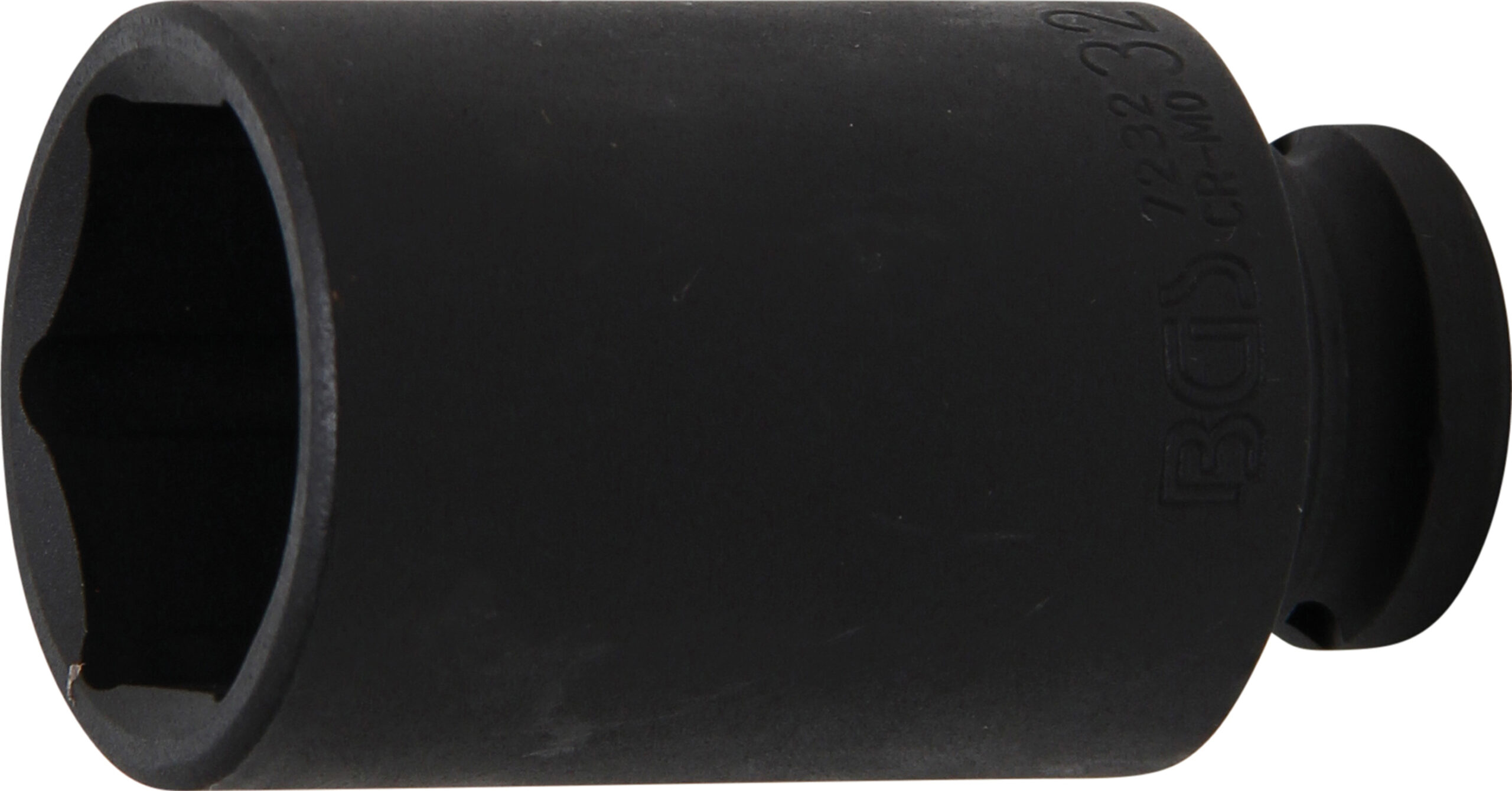 für Hand- und Schlagschrauberbetrieb geeignet mit Aufnahme für Arretierstift und Gummiring Technische Daten Schlüsselweite 32 mm Länge ca. 78 mm Antriebsprofil Innenvierkant Antriebsprofilgröße metrisch 125 mm Oberflächenvergütung Phosphatiert Antriebsprofilgröße imperial 12 Material Chrom-Molybdän-Stahl Abtriebsprofil Sechskant Bruttogewicht 440 g