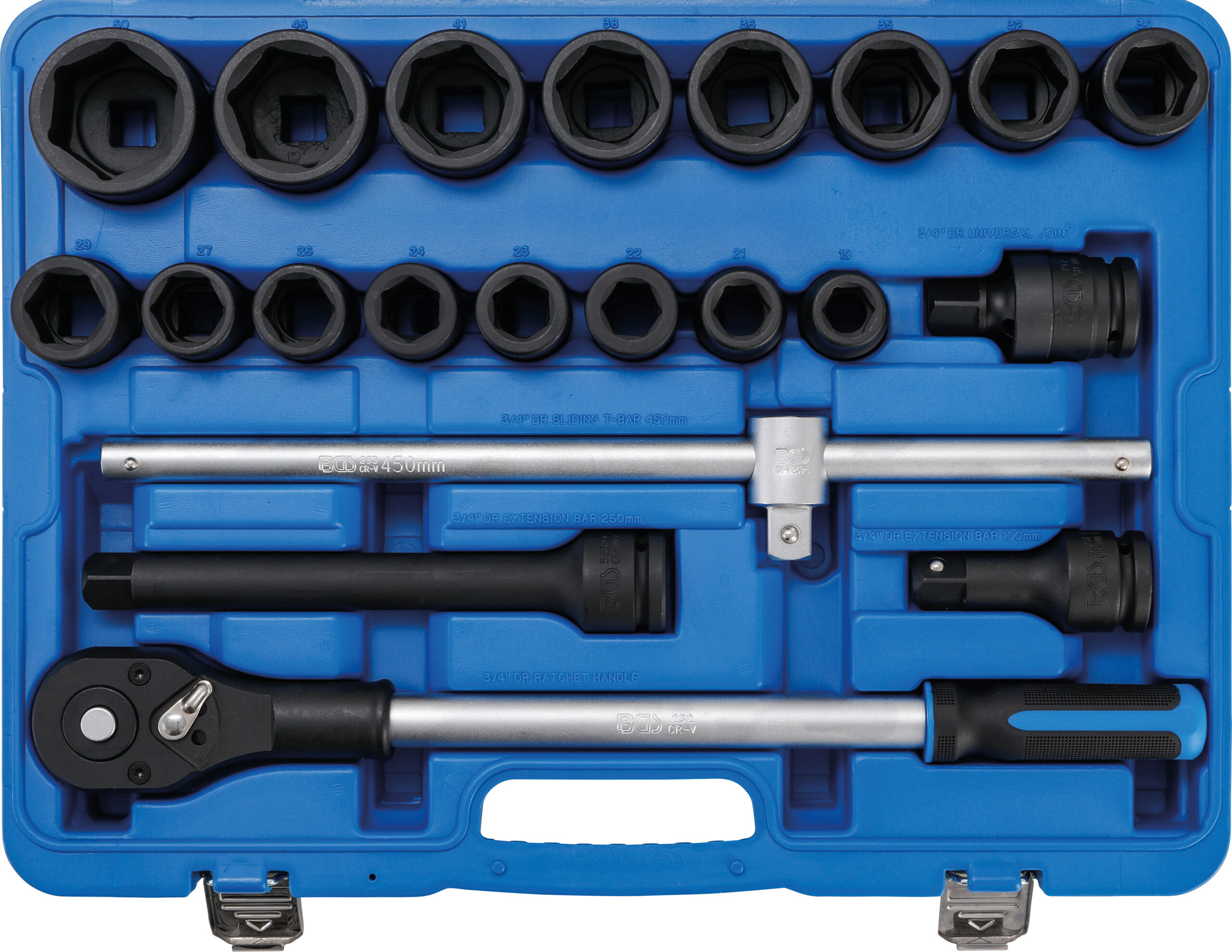 für Hand- und Schlagschrauberbetrieb geeignet mit Aufnahme für Arretierstift und Gummiring Lieferumfang Gleitgriff 450 mm lang Umschaltknarre mit Einsatz-Schnelllöser Länge 505 mm Verlängerungen in 105 mm und 250 mm Kardangelenk 105 mm Kraft-Steckschlüssel-Einsätze Sechskant Antrieb Innenvierkant 20 mm 34 SW 19 – 21 – 22 – 23 – 24 – 26 – 27 – 29 -32 – 35 – 36 – 38 – 41 – 46 – 50 mm Technische Daten Material Chrom-Molybdän-Stahl Bruttogewicht 16810 g