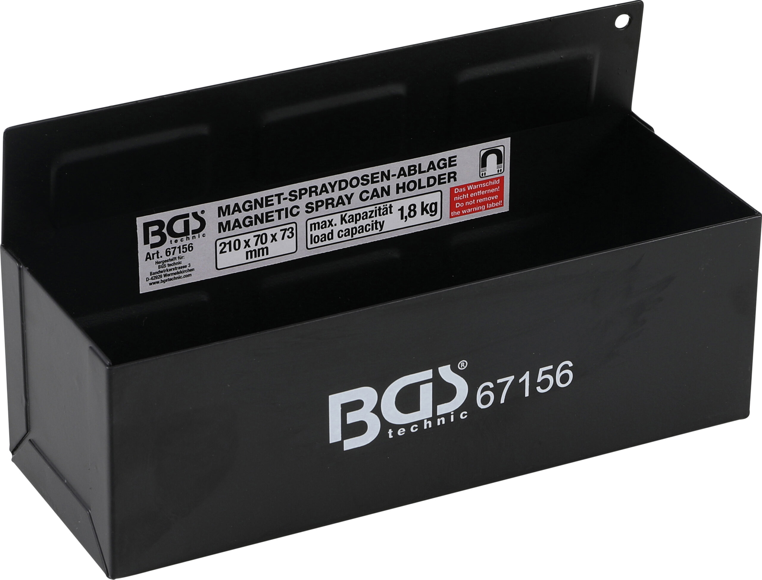 für z.B. 3 Spraydosen mit Ø 73 mm 6 starke Magnete Haltekraft ca. 18 kg 10 Bohrungen Ø 19 mm im Boden für Schraubendreher etc. Maße 210 x 75 x 70 mm Technische Daten Bruttogewicht 880 g