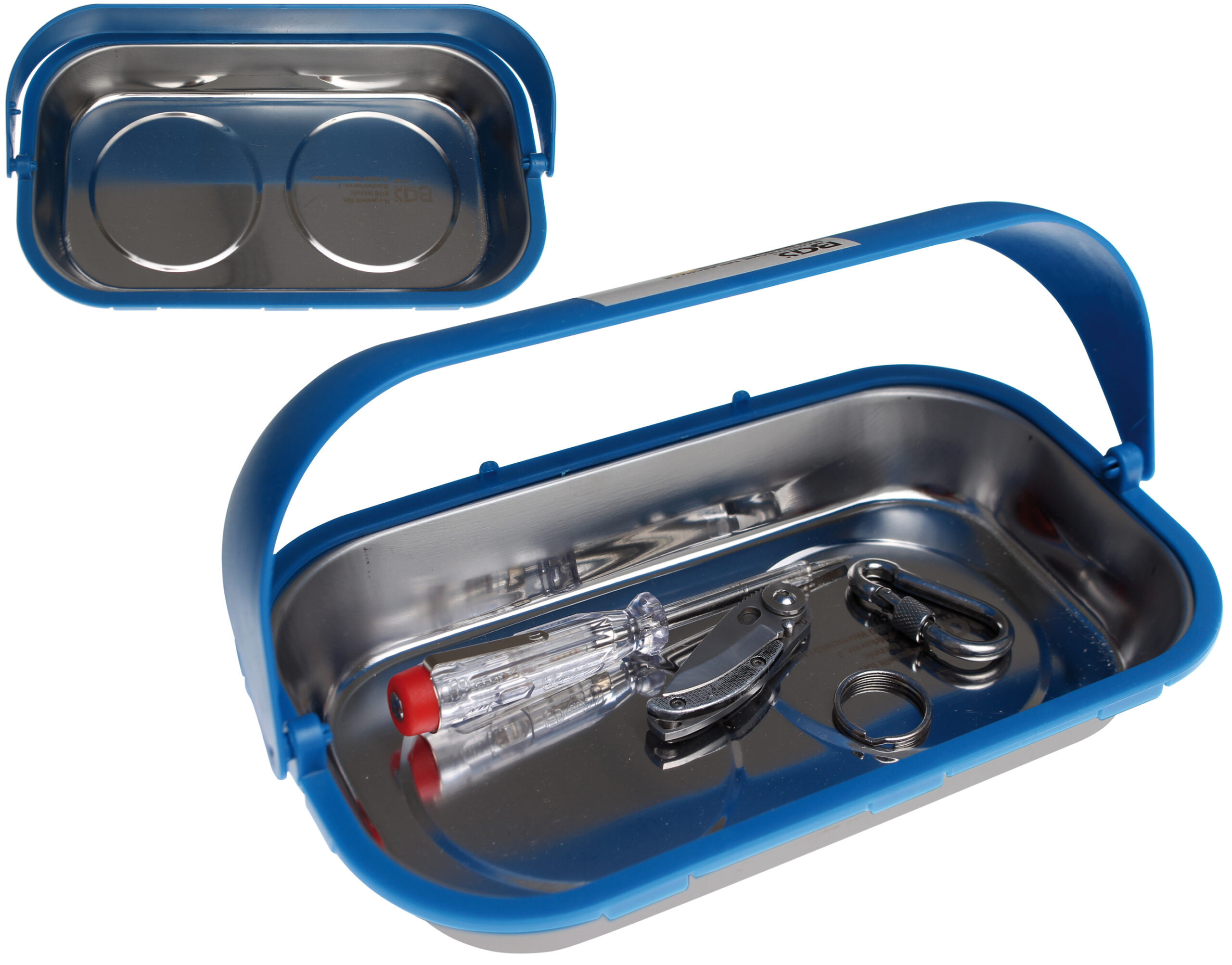 gummierte Magnete schützt Oberflächen vor Kratzern schwenkbarer Schirm für besseren Halt von Teilen in vertikaler und horizontaler Position Magnet-Haltekraft 5 kg Schalenmaterial Edelstahl mit Rand aus Polystyrol Schirmabmessungen 249 x 56 mm Technische Daten Länge 249 mm Bruttogewicht 710 g Breite 152 mm Höhe 54 mm