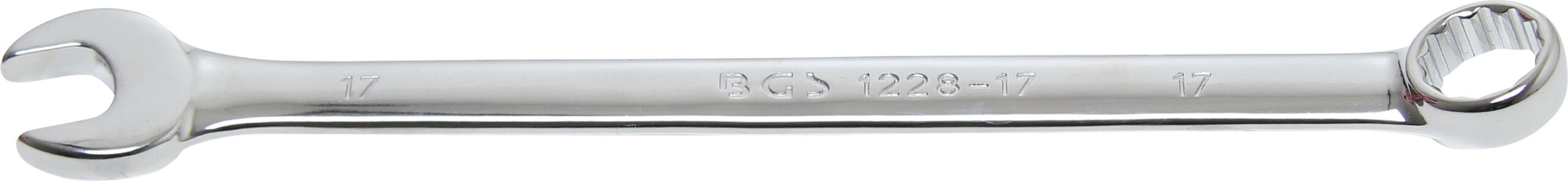 kalt geschmiedet gehärtet hochglanz verchromt Ringende 15 abgewinkelt Abtriebsprofil Ringseite Zwölfkant extra lang Technische Daten Bruttogewicht 190 g Länge 255 mm Material Chrom-Vanadium-Stahl Schlüsselweite 1 17 mm Schlüsselweite 2 17 mm