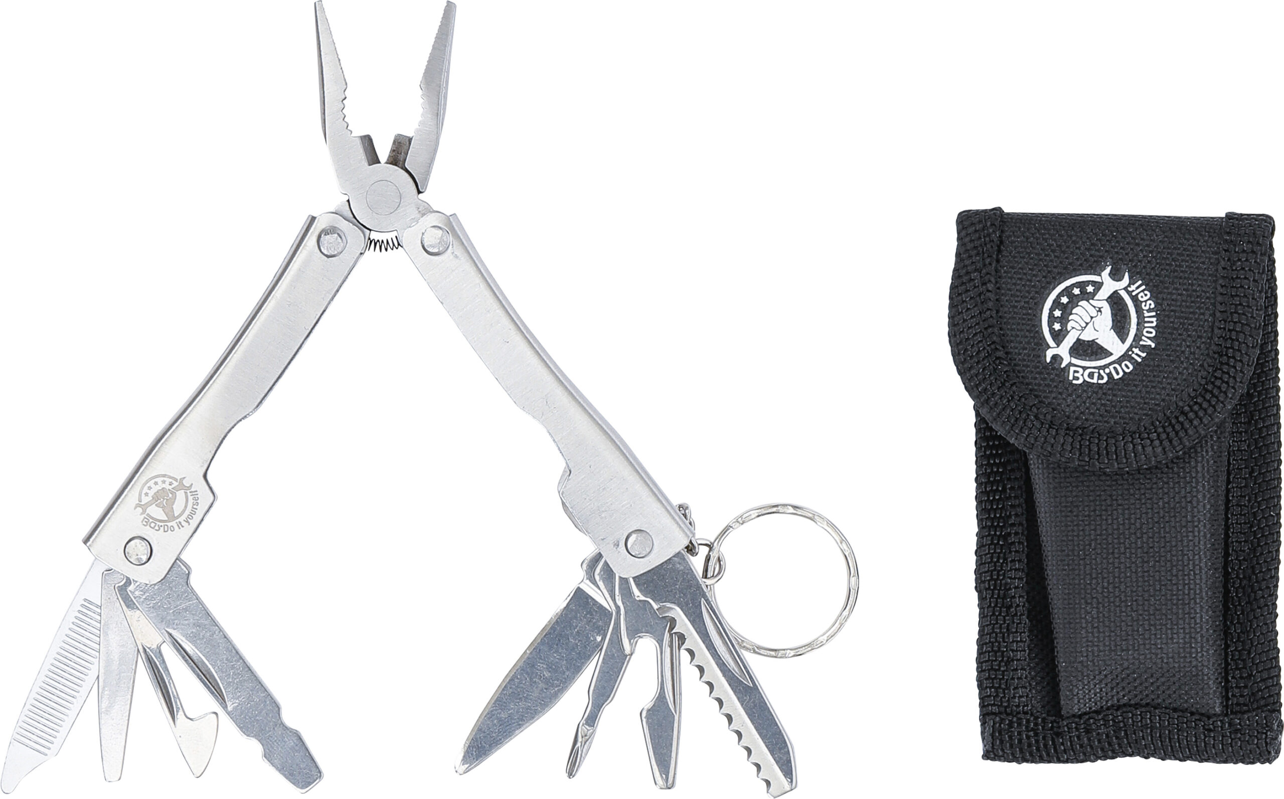 Universalwerkzeug im Taschenformat enthaltene Werkzeuge Messer Kreuzschlitzschraubendreher Kapselheber Mini-Säge Mittlerer Schraubendreher Nagelfeile Nagelreiniger Schlitzschraubendreher Kombinationszange 100 mm rostfreier Stahl klappbar eingeklappt nur 70 mm mit Gürteltasche Technische Daten Bruttogewicht 110 g Verpackung für Wandbehang geeignet Ja