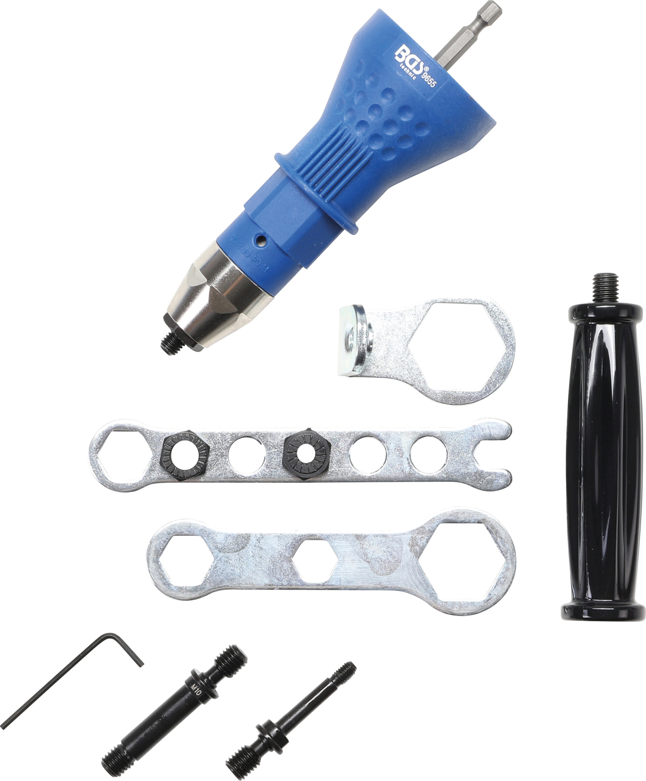 verwandelt jede Bohrmaschine in eine Nietzange zur Verwendung mit handelsüblichen Bohrmaschinen mit Rechts-Linkslauf Drehmoment 50 – 100 Nm mit Montageschlüssel Gewindedorne und Mundstücke in M6 – M8 – M10 Technische Daten Bruttogewicht 740 g