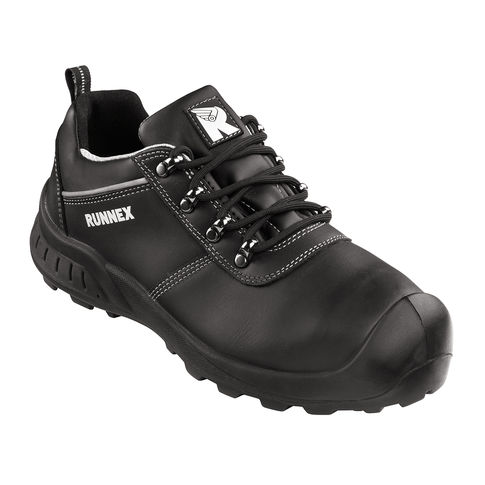 ruNNex S3-Sicherheitshalbschuhe Obermaterial aus hydrophobiertem Glattleder reflektierende Biese ruNNex AIRSTREAM-Funktionsfutter PU-Laufsohle mit PU-Zwischensohle und Überkappe gepolsterte Faltlasche Alu-Protection-Kappen ganzflächige Einlegesohle zum Auswechseln aus Poliyou SRC-Rutschhemmung EN ISO 203452011 Stoßfeste Aluminium-Kappen reduzieren das Gewicht sind athermisch nicht magnetisch und korrosionsbeständig. Beim ruNNex EVA-Dämpfungssystem arbeitet die Sohle mit Bei …