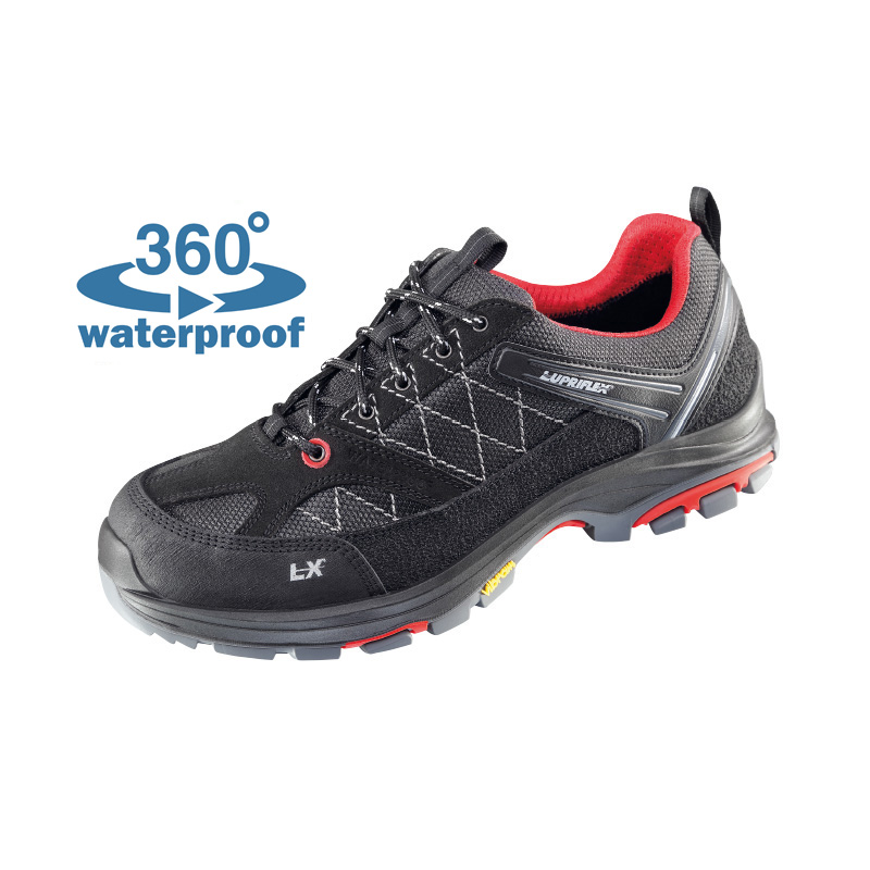 Wasserdichter Sicherheitshalbschuh Ausstattung Veloursleder und Cordura atmungsaktive Klimamembran gepolsterte Faltlasche umlaufender Stoßschutz austauschbares anatomisches Vollfußbett gelochte Stahlkappe für verbesserte Atmungsaktivität Größen 36 47 Weite 115 Sohle Vibram Dynamic Red TPUPU