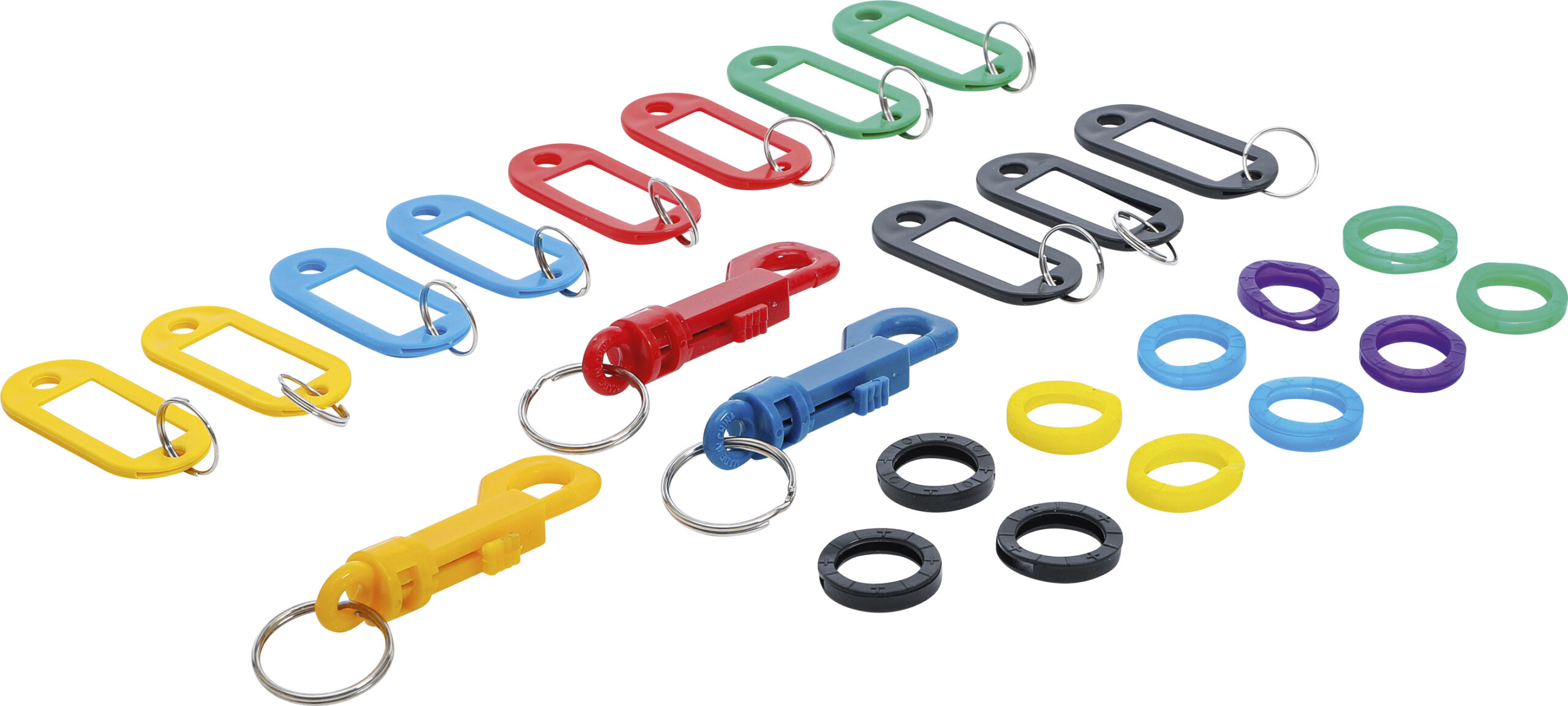 Lieferumfang 3 schwarze 2 rote 2 gelbe 2 blaue und 2 grüne Schlüsselfahnen mit Schriftfenster 1 gelber 1 blauer und 1 roter Karabiner 3 schwarze 2 lila 2 gelbe 2 blaue und 2 grüne Schlüsselringe zur farblichen Kennzeichnung Technische Daten Verpackung für Wandbehang geeignet Ja Bruttogewicht 60 g