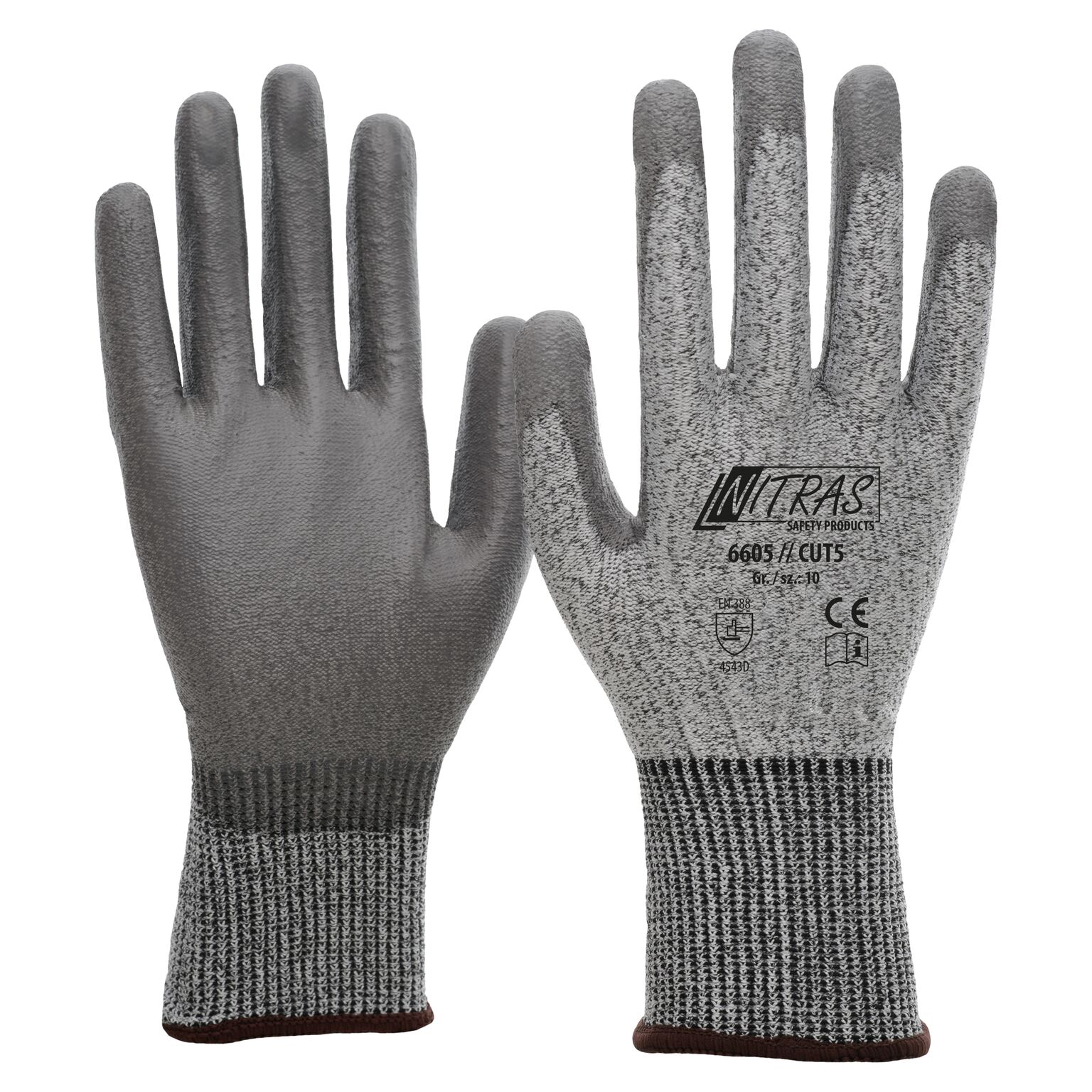 Material Spezialgarn grau Beschichtung PU grau Größen 6 7 8 9 10 11 Zertifizierung EN 388 NITRAS CUT5 Schnittschutzhandschuhe grau PU-Beschichtung teilbeschichtet auf Innenhand und Fingerkuppen grau Strickbund sehr hoher Schnittschutz höchster Tragekomfort Spezialgarn EN 388 4543D