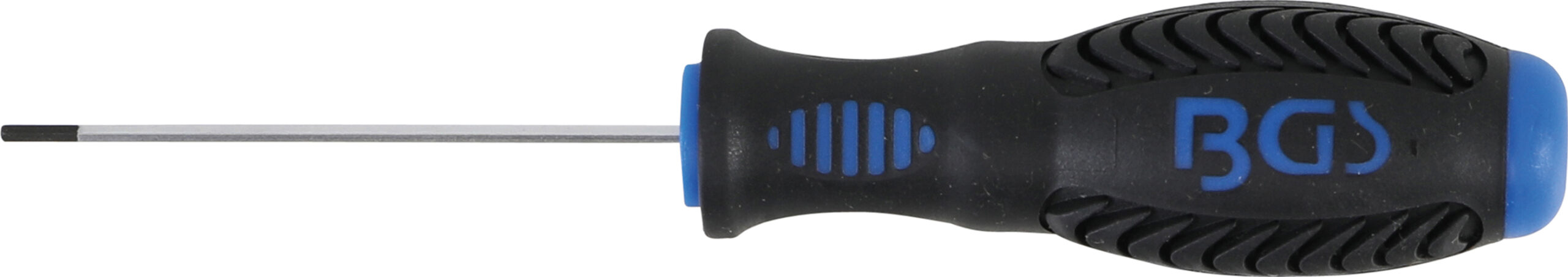 2-Komponentengriff mit rutschsicherem Griffprofil verchromt mit schwarzen Spitzen Technische Daten Bruttogewicht 20 g Klingenlänge 75 mm Abtriebsprofil Innensechskant Material Chrom-Vanadium-Stahl Abtriebsprofilgröße 2 mm