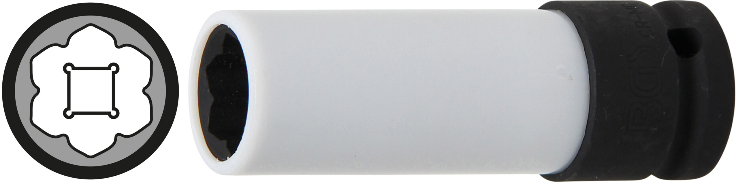 für Hand- und Schlagschrauberbetrieb mit Aufnahme für Arretierstift und Gummiring mit Kunststoffmantel und Kunststoffeinsatz zum Schutz der Alufelgen Spezialprofil für Mercedes Benz Schlüsselweite MS 17 mm Länge 85 mm Technische Daten Antriebsprofil Innenvierkant Antriebsprofilgröße metrisch 125 mm Antriebsprofilgröße imperial 12 Material Chrom-Molybdän-Stahl Bruttogewicht 220 g Verpackung für Wandbehang geeignet Ja