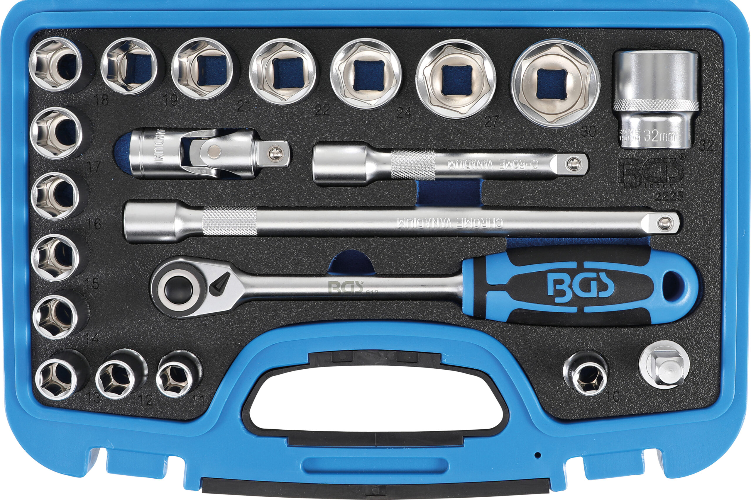 Steckschlüssel-Einsätze in Sechskant Pro Torque-Ausführung verchromt poliert Antrieb Innenvierkant 125 mm 12 feinverzahnte Umschaltknarren extra slim 72 Zähne mit Einsatz-Schnelllöser gerade Ausführung im BGS Systemkoffer mit EPE-Schaumeinlage Lieferumfang 1 Umschaltknarre 2 Verlängerungen 125 und 250 mm 1 Gleitgriff-Adapter 1 Kardangelenk 16 Steckschlüssel-Einsätze SW 10 – 11 – 12 – 13 – 14 – 15 – 16 – 17 – 18 – 19 – 21 – 22 – 24 – 27 – 30 – 32 mm Technische Daten Bruttogewich…