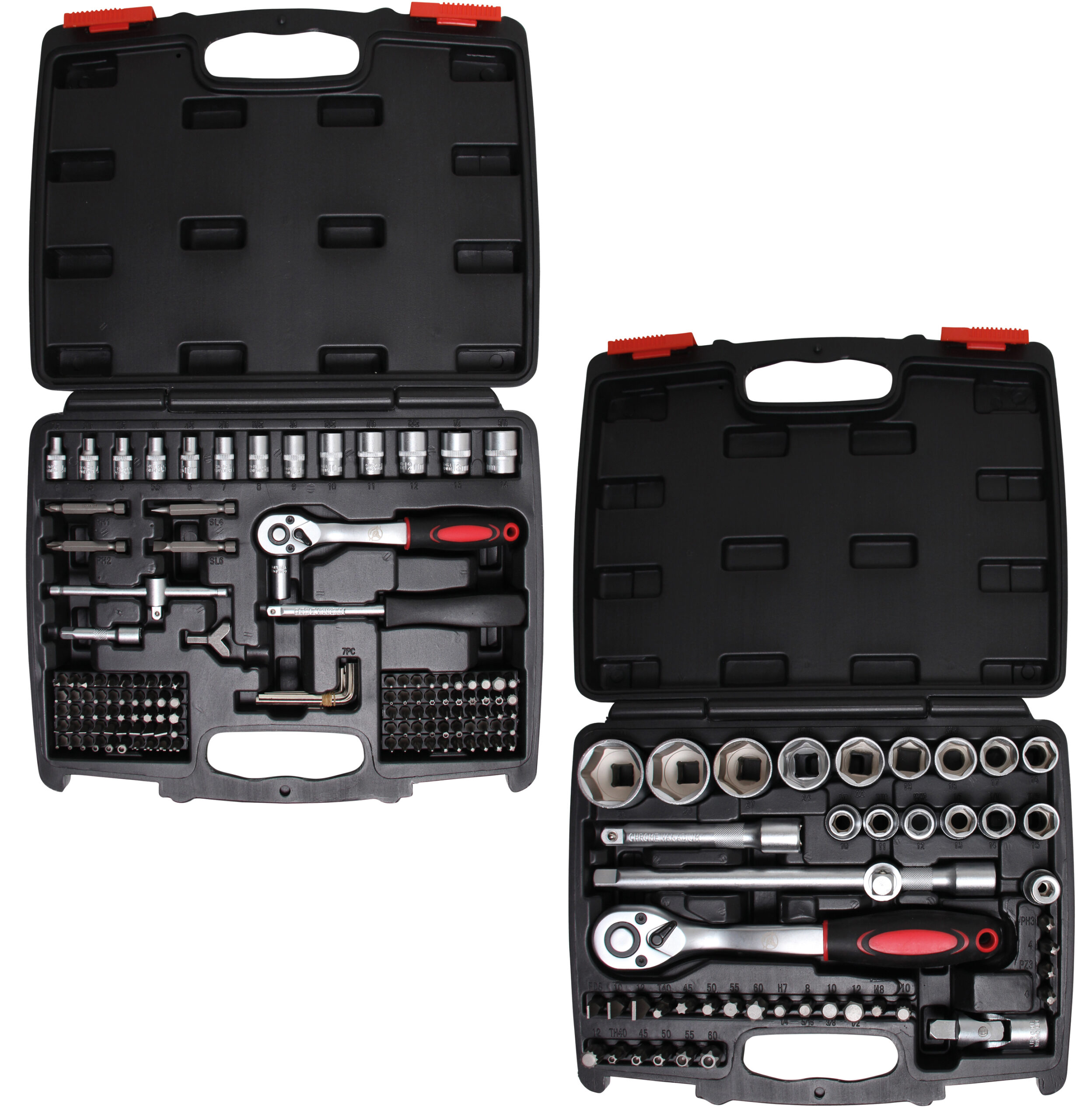 2 Steckschlüssel-Sätze 1. Steckschlüssel-Satz 63 mm 14 130-tlg. Umschaltknarre feinverzahnt 72 Zähne mit Einsatz-Schnelllöser Verlängerung 50 mm Gleitgriff Drehgriff 150 mm Steckschlüssel-Einsätze Sechskant SW 4 – 4.5 – 5 – 55 – 6 – 7 – 8 – 9 – 10 – 11 – 12 – 13 – 14 mm Bitadapter Bits Kreuzschlitz Länge 50 mm PZ1 – PZ2 Schlitz Länge 50 mm 4 – 6 mm Flügelmutter-Bit Innensechskant ohne Bohrung Zollgößen 116 – 564 – 332 – 764 – 18 – 964 – 532 – 316 – 732 – 1…