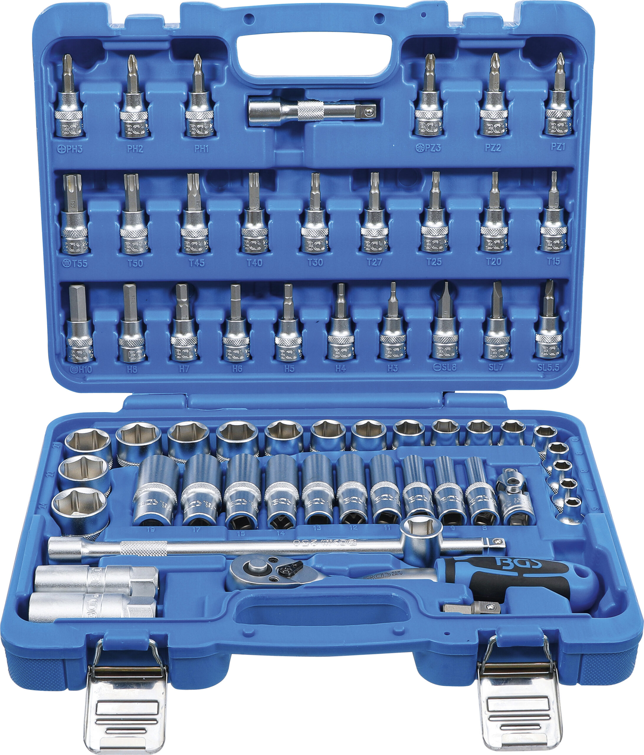 Lieferumfang Werkzeuge mit Antrieb 10 mm 38 Knarre feinverzahnt 72 Zähne Verlängerung 75 mm Gleitgriffadapter Kardangelenk Sechskant-Adapter 8 mm Zündkerzen-Einsätze SW 16 + 21 mm 18 x Seckschlüssel-Einsätze Sechskant SW 6 – 7 – 8 – 9 – 10 – 11 – 12 – 13 – 14 – 15 – 16 – 17 – 18 – 19 – 20 – 21 – 22 – 24 mm 10 x Seckschlüssel-Einsätze Sechskant lang SW 8 – 9 – 10 – 11 – 12 – 13 – 14 – 15 – 17 – 19 mm 25 x Bit-Einsätze Schlitz 55 – 7 – 8 mm Kreuzschlitz PH1 – PH2 – PH3 Kreuzschlit…
