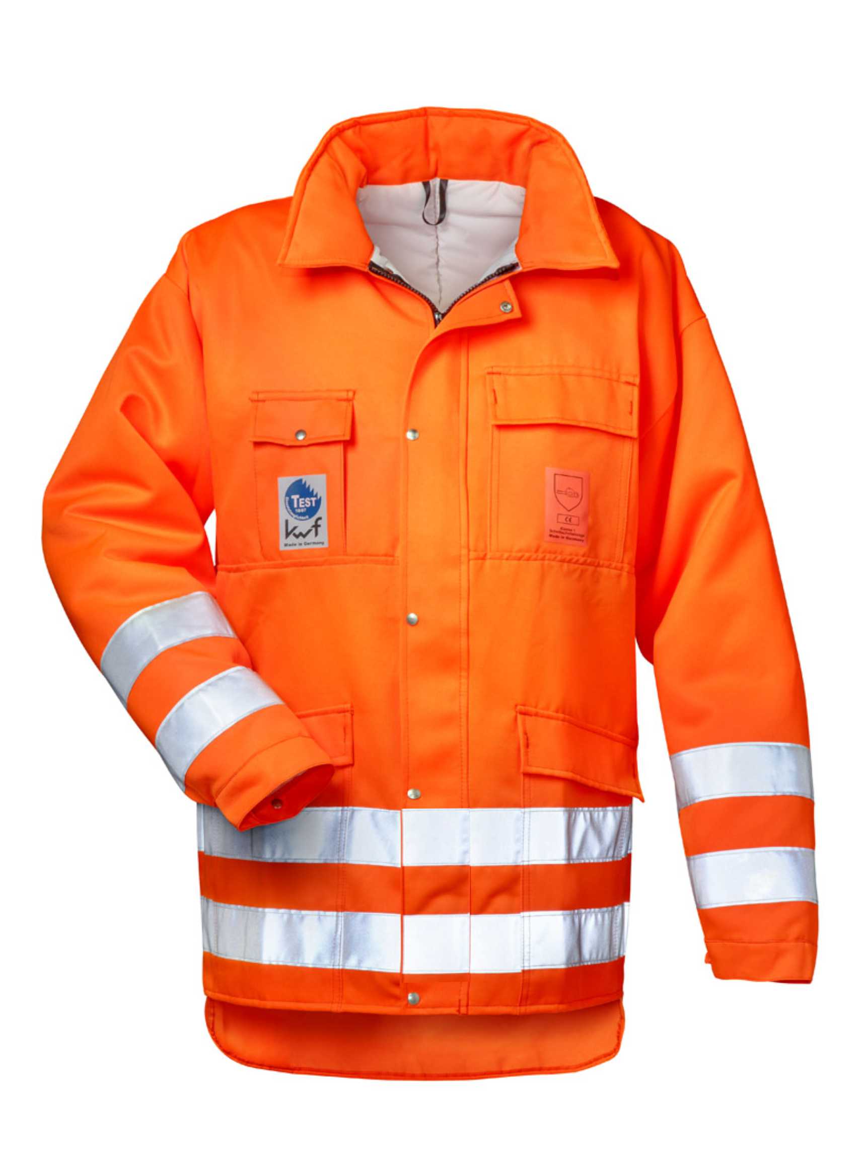 Norm EN ISO 20471 Klasse 2 EN 38110 + 11 Klasse 1 Obermaterial 70% Polyester 30% Baumwolle ca. 245 gm² Farbe fluoreszierend orange Größen MXXXL DPLF-geprüfte Schnittschutzeinlage in Brust Rücken und Ärmeln verdeckter YKK-Front-Reißverschluss Ärmelbündchen mit Weitenverstellung verdeckter Front-Reißverschluss mit Knöpfen verlängertes Rückenteil Taschen 1 aufgesetzte Brusttasche mit Patte 1 augesetzte Handytasche mit Patte 2 aufgesetzte Seitentaschen mit Patten und…