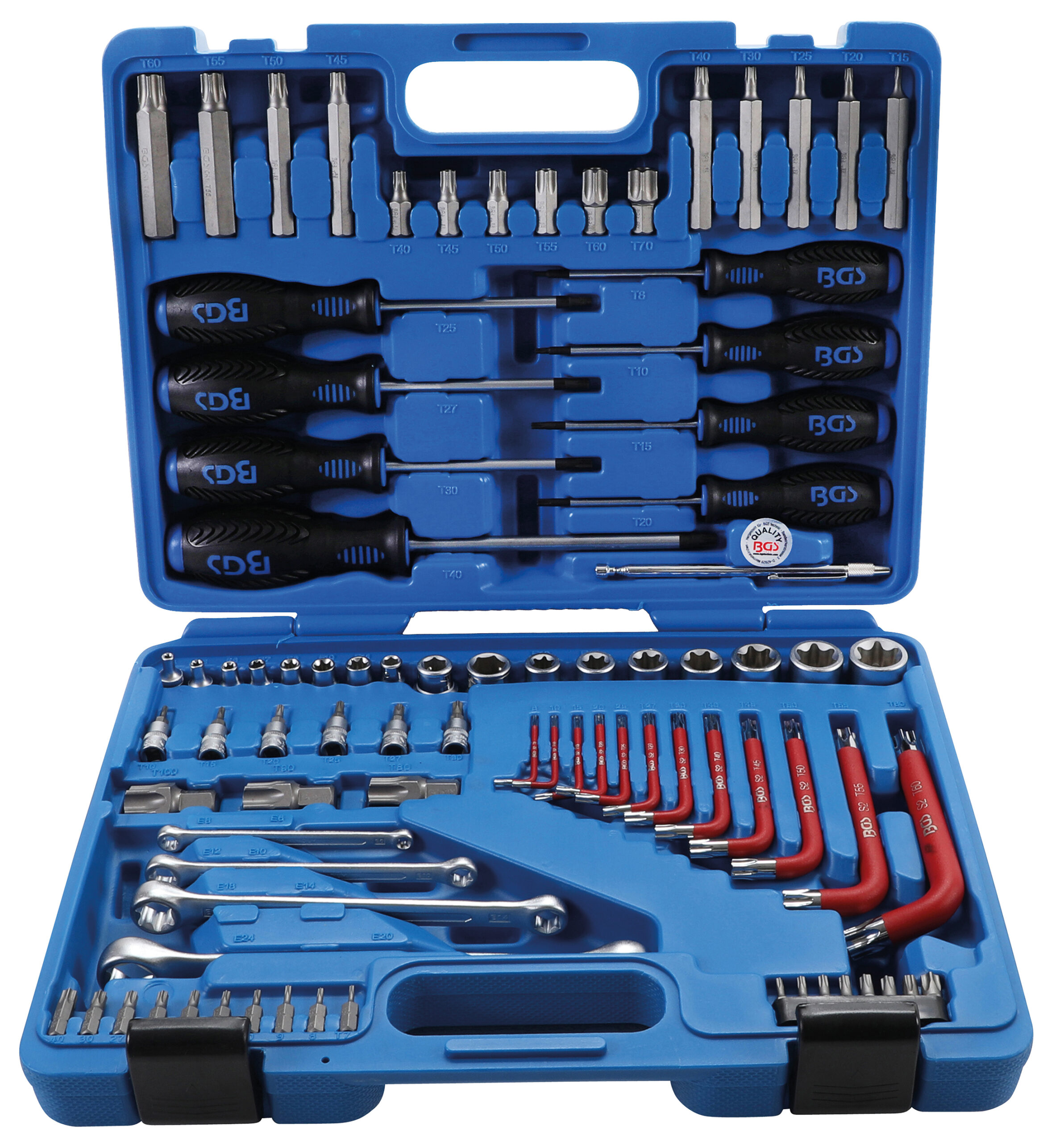 Lieferumfang 6 Bits Länge 30 mm 10 mm Schaft T-Profil für Torx mit Bohrung T40 – T45 – T50 – T55 – T60 – T70 7 Bits Länge 75 mm 10 mm Schaft T-Profil für Torx T15 – T20 – T25 – T30 – T40 – T45 – T50 2 Bits Länge 75 mm 14 mm Schaft T-Profil für Torx T55 – T60 3 Bits Länge 40 mm 14 mm Schaft T-Profil für Torx mit Bohrung T80 – T90 – T100 12 Winkelschlüssel T-Profil für Torx T8 – T10 – T15 – T20 – T25 – T27 – T30 – T40 – T45 – T50 – T55 – T60 8 Schraubendreher T-Pro…
