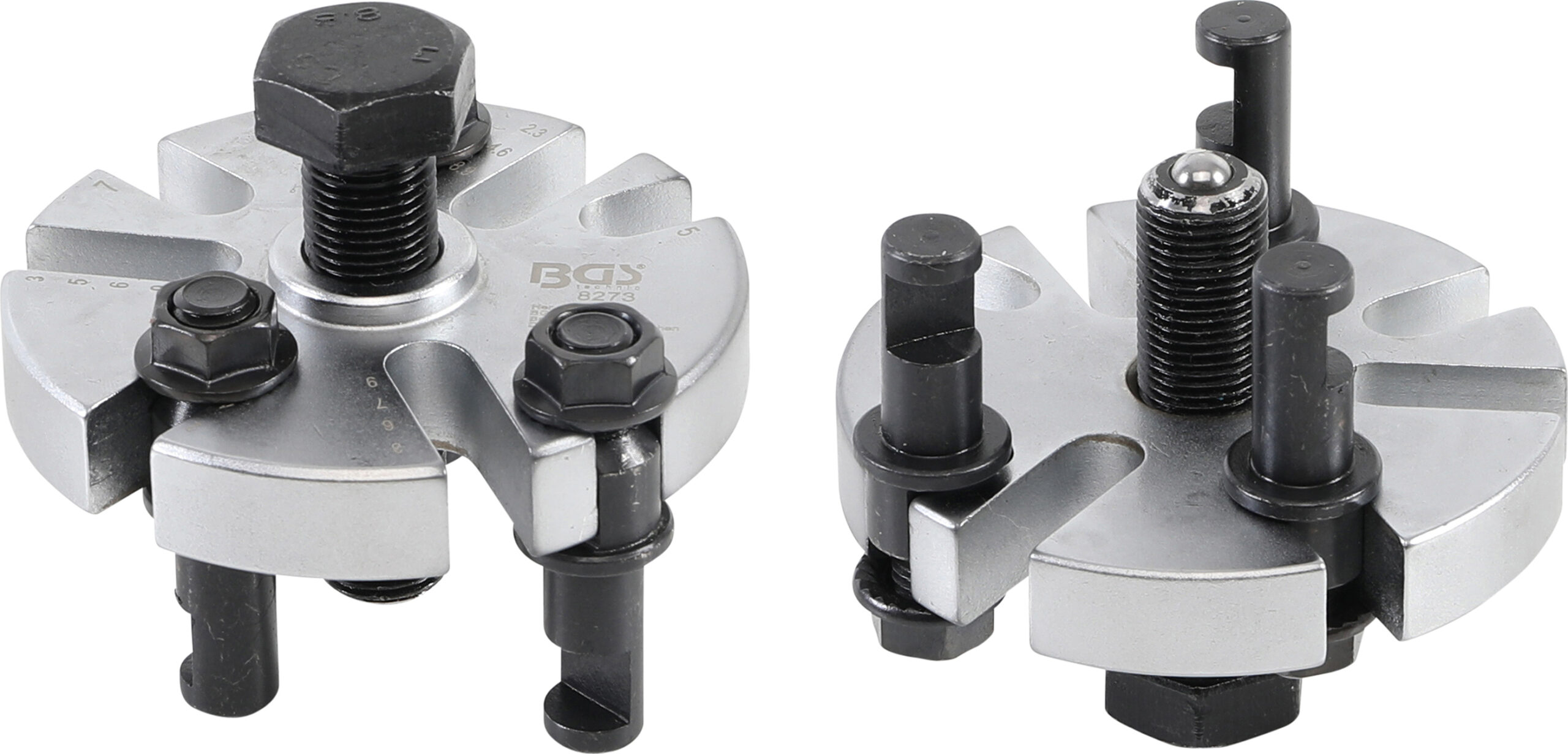 zur zerstörungsfreien Demontage von Zahnriemenrädern für verschiedene Lochkreise und Abstände geeignet Abzieherplatte mit 8 Nuten zur Aufnahme der Abzieharme Abzieharme 18 mm 16 mm Abziehspindel mit Zentrierkugel und 24 mm Antrieb Technische Daten Bruttogewicht 840 g